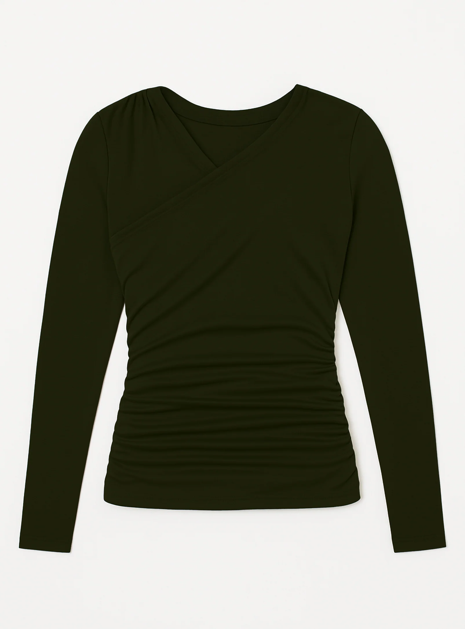Refresh your wardrobe with this must-have front-ruched V-neck top, where comfort meets chic, figure-flattering design.
