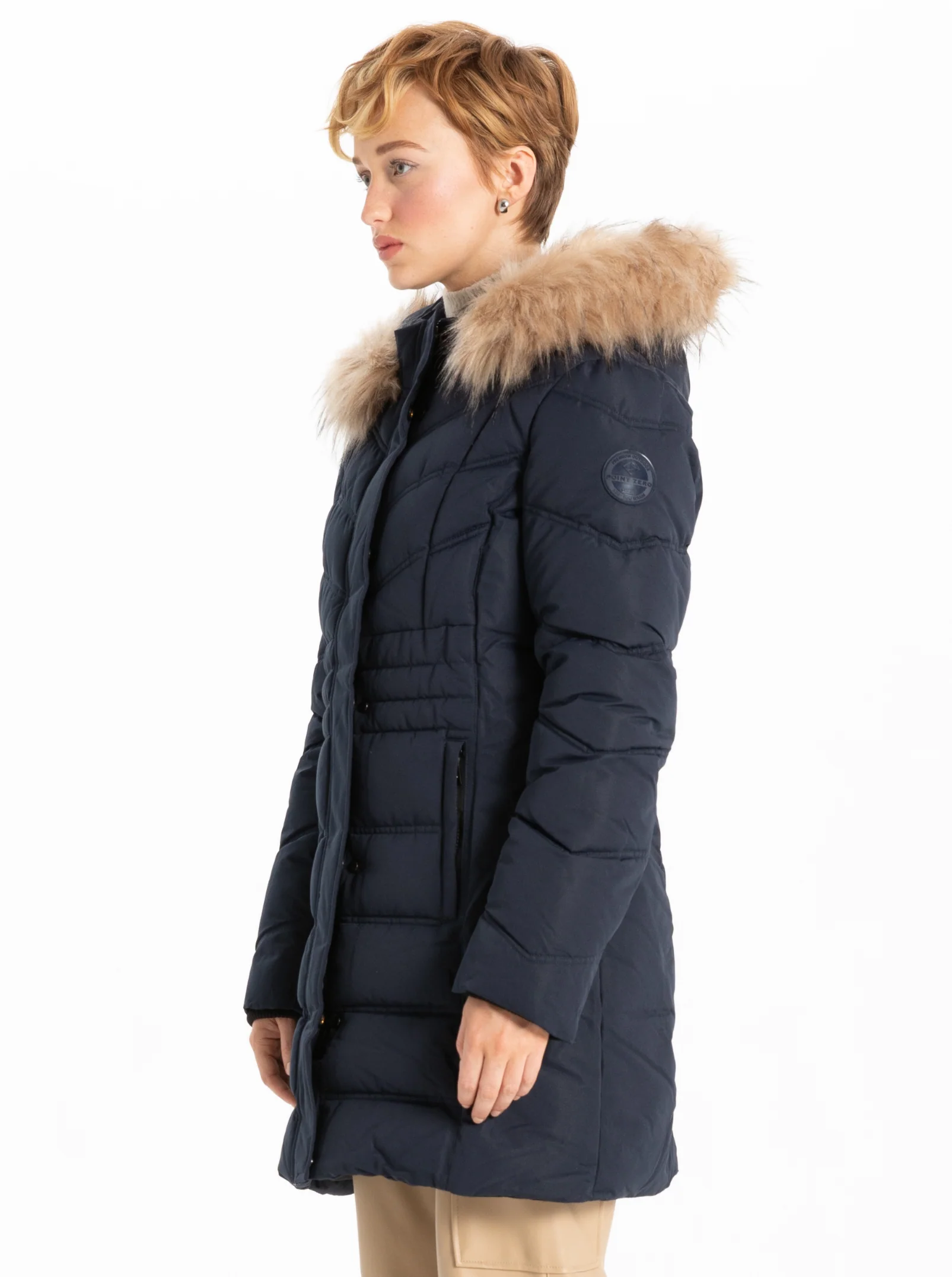 The luxurious faux fur lining along the hood adds a touch of elegance, while the long length provides extra coverage against the elements. Designed with practicality in mind, this parka also features multiple pockets for your essentials.